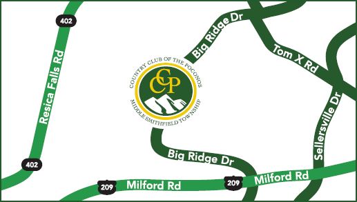 Take I-476 N to Route 22 E exit in Allentown. Follow Route 22 E to Route 33 N to US-209 N into I-80 E to exit 309. Take exit 309 to merge onto PA-447 N/US-209 N toward Marshalls Creek. Turn right at US-209N/Milford Road. Make left on to Sellersville Drive. Make a left on to Pondside Drive. Make a right onto Big Ridge Drive and continue for 1.3 miles. Club house will be on your left (follow signs to banquet hall & public golf course)